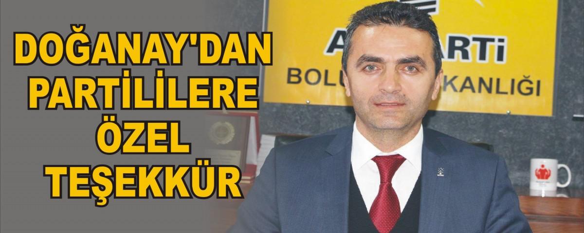 İl Başkanı Doğanay yaptığı açıklamada, “Bu akşam gerçekleştirdiğimiz genişletilmiş İl Danışma Meclisimiz ve vefa yemeğine katılımlarıyla bizleri onurlandıran Enerji ve Tabii Kaynaklar Eski Bakanı ve Kayseri Milletvekilimiz Sayın Taner Yıldız’a, Ekonomi Bakan Yardımcımız Sayın Fatih Metin’e, Milletvekillerimiz Sayın Mehmet Güner ve Sayın Ali Ercoşkun’a, Kurucular Kurulu üyemiz Sayın Habibe Güner’e, 2001 yılından bugüne partimizin her kademesinde görev alarak davamızı bugünlere taşıyan ve bu gün de dava aşkıyla, istiklal ve istikbali için hayati önem taşıyan referandum öncesi Bolu teşkilatlarımızın birliğini ve dirliğini göstermek için salonu hınca hınç dolduran Ak Parti Bolu İl Teşkilatı’nın her kademesinde görev yapan teşkilat mensuplarımıza, mahalle-köy-sandık temsilcilerimize, Belediye Meclis Üyelerimize, İl Genel Meclisi Üyelerimize, İlçe ve Belde Belediye Başkanlarımıza, İl ve İlçe Gençlik Kolları Başkan ve Yönetim Kurulu Üyelerine, İl ve İlçe Kadın Kolları Başkanlarımıza, İlçe ve Belde Başkanlarıma ve Yönetim Kurulu Üyelerimize, İl Genel Meclisi Başkanımız Sayın Yaşar Yüceer’e, Bolu Belediye Başkanı Sayın Alaaddin Yılmaz’a, İl Kadın Kolları Başkanımız Sayın Arzu Aydın ve Yönetim Kurulu Üyelerine, İl Gençlik Kolları Başkanımız Sayın Taha Furkan Sönmezel ve Yönetim Kurulu Üyelerine ve de birlikte yol arkadaşlığı yapmaktan onur duyduğum İl Yönetim Kurulu Üyesi arkadaşlarıma teşekkür ederim” ifadelerini kullandı.