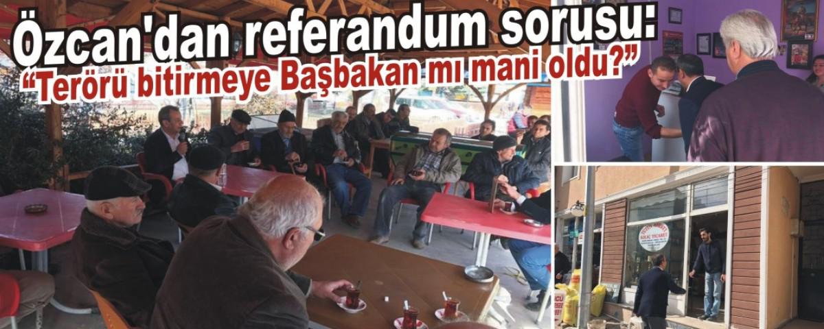 Özcan konuşmasının devamında “Sayın Erdoğan, konuşmalarında Başkanlık gelirde ben ülkeyi tek başıma yönetirsem terör örgütleri bitecek diyor. Biliyorsunuz getirmek istedikleri sistemde Başbakan olmayacak. Şimdi Sayın Cumhurbaşkanına soruyorum; 15 yıldır sen terörü bitirmek istedin de buna Başbakan mı mani oldu? Varsa böyle bir şey bizimle de paylaş da bizde bilelim” dedi.