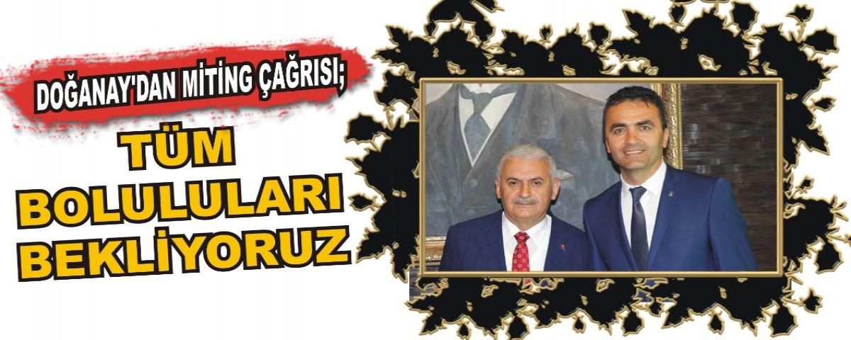 Bolululara davette bulunan AK Parti İl Başkanı Nurettin Doğanay; "Çocuklarımızın geleceği, milletimizin ve devletimizin bekası için 18 maddeyi içeren Anayasa değişikliği ve Cumhurbaşkanlığı Hükümet Sistemi için 16 Nisan’da yapılacak Halkoylaması kampanya süreci kapsamında, Başbakanımız Sayın Binali Yıldırım 10 Mart Cuma günü saat 16.00'da Bolumuza teşrif edecekler. Başbakanımız Bolu Demokrasi Meydanında (Belediye önünde) değerli Bolu halkımıza hitap edecek. Yapılacak mitingimize, bu mutlu günümüze değerli Bolulu hemşerilerimi davet ediyorum" dedi.