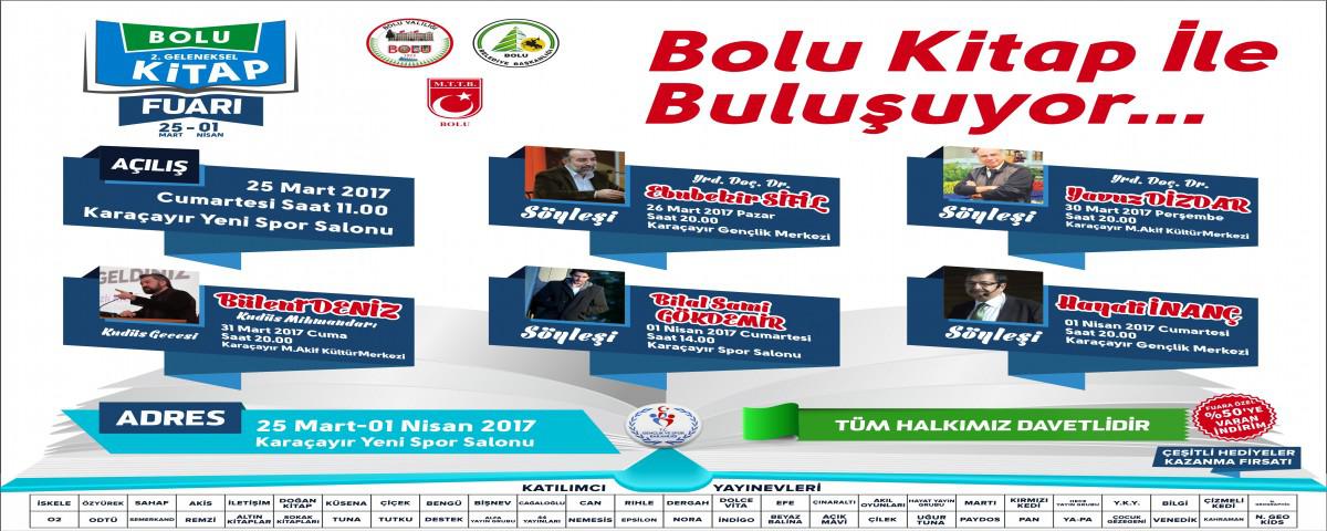 53 yayınevinin 35 stant ile katılacağı fuar kapsamında akşam programları da yer alacak. Alanlarında uzman konuklar bu programlarda Bolu halkıyla buluşup sohbet tadında programlar yapacaklar. Bu kapsamda 25 Mart Pazar günü Yrd. Doç. Ebubekir Sifil ve 01 Nisan Cumartesi günü Av. Hayati İnanç ile Karaçayır Gençli Merkezi salonunda, 30 Mart Perşembe günü Yrd. Doç. Yavuz Dizdar ve 31 Mart Cuma günü Kudüs Mihmandarı Bülent Deniz Karaçayır Mehmet Akif Kültür Merkezi’nde sevenleriyle saat 20:00’da buluşacaklar. Yine 01 Nisan Cumartesi günü saat 14:00’da genç yazar Bilal Sami Gökdemir’in fuar alanında imza ve söyleşi programı gerçekleştireceği etkinlikte, hatırı sayılır bir hayran kitlesine sahip müzisyen ve yazar Ahmet Şafak da fuar boyunca hayranlarıyla buluşup kitap imzalayacak.