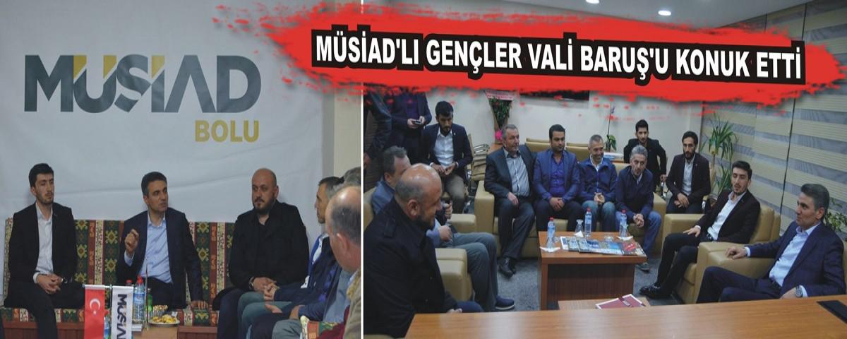 MÜSİAD Bolu Gençlik Kurulu ''Vizyon Buluşmaları''nın konuğu Bolu Valisi Aydın Baruş oldu. Yaklaşık üç saat süren ve sohbet havasında geçen buluşmada Vali BARUŞ ile anayasa değişikliği, iş dünyası ve istihdam seferberliği, eğitim sistemi üzerinde duruldu. Buluşmaya MÜSİAD üyeleri ve misafir iş adamlarıyla birlikte TÜGVA Bolu Temsilcisi Sadık Kuru ve TÜGVAlı gençler katıldı. Sefa Günay