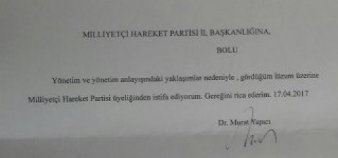 Yapıcı bu gün yaptığı paylaşım ile, MHP’den istifa ettiğine dair dilekçeyi sosyal medya hesabından paylaştı.