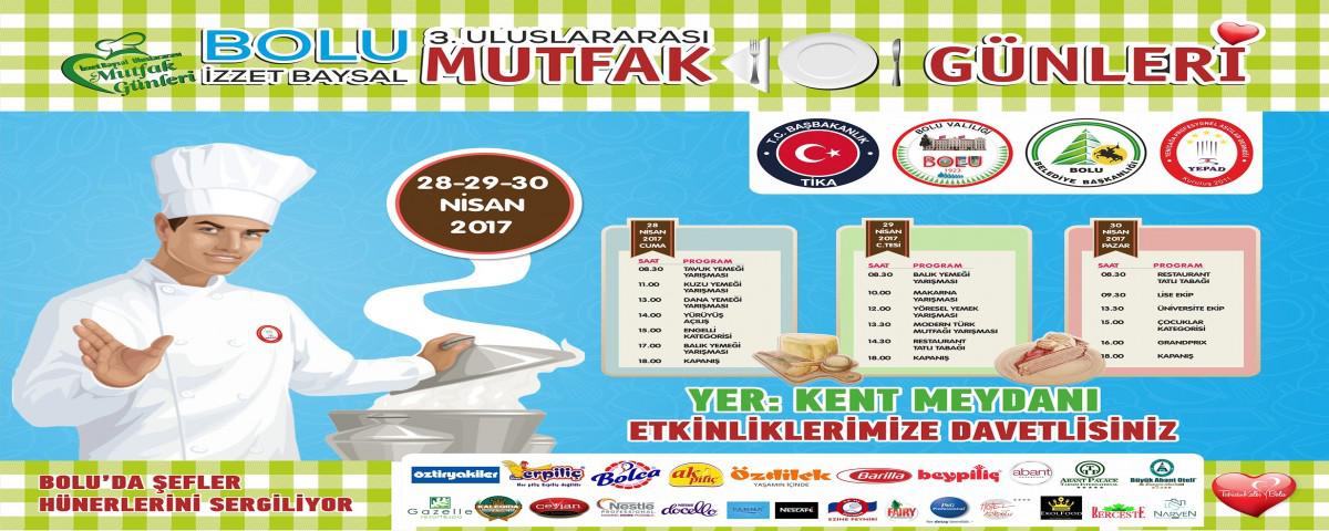 Bolu Belediyesi’nin Türk İşbirliği ve Koordinasyon Ajansı (TİKA), Bolu Valiliği ve Yeniçağa Profesyonel Aşçılar Derneği (YEPAD) ile organize ettiği 3’üncü Bolu İzzet Baysal Uluslararası Mutfak Günleri Ukrayna, Romanya, Mısır, Azerbaycan ve Kuzey Kıbrıs Türk Cumhuriyeti’nden 13, toplamda 450 yarışmacının katılımıyla bu hafta sonu yapılacak. Dünya Şefler Birliği (WACS) Başkanı Thomas Andreas Gugler ve yurtdışından gelen 36 jüri üyesi, 12 kategoride yarışacak yemek ustalarının hünerlerini değerlendirecek. Etkinlikte dünyaca ünlü şefler Alan Payen, Anil Grover, Anna Gasanova, Dimithu Kumarasigne, Dragica Lukin, Eduardo Colonerus, Emrah Köksal Sezgin, Karlheinz Haase ve Hilmar Bragi Jonsson gibi önemli şeflerin jüri üyesi olacağı yarışmalarda ilk gün engelli kategorisinde yarışacak engelli mutfak ustaları, son gün ise genç ve çocuk kategorisinde geleceğin marifetli aşçıları hünerlerini sunacak.