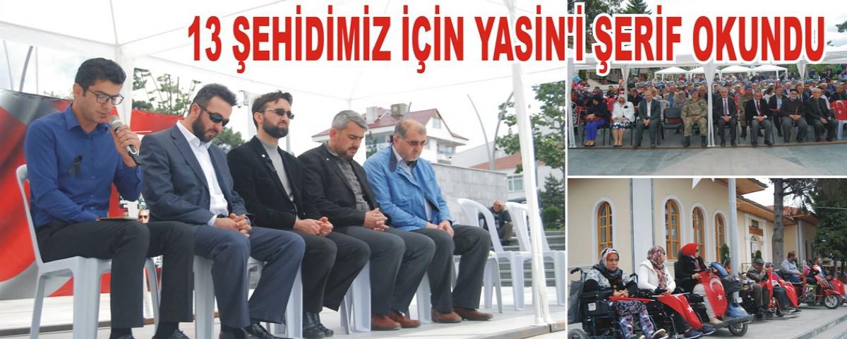 Şırnak Uludere ilçesi Şenoba beldesinden havalanan ve yüksek gerilim hattına takılarak düşen Cougar tipi helikopterin içinde bulunan ve şehit düşen 13 askerlerimiz için Kent Meydanında Yasin'i Şerif okutuldu. Bolu Tugay komutanlığından askerlerin de katıldığı Yasin'i Şerif programına Bolu Belediye Başkan yardımcısı Emine Davarcıoğlu, AİBÜ Rektörü Prof. Dr. Süleyman Mollaibrahimoğlu, Bolu Tugay Komutanı Piyade Kurmay Albay Muammer Alper katıldı. Kent meydanında okutulan Yasin'i Şerif’e vatandaşlar büyük ilgi gösterdi.
