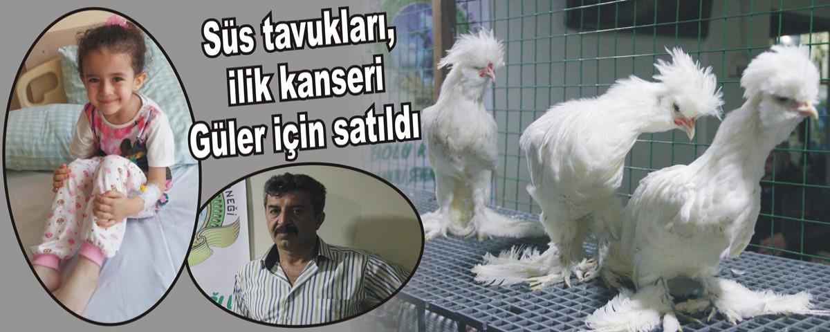 Bolu’da, 5 ay önce dizlerindeki ağrı nedeniyle hastaneye götürülen ve ilik kanseri teşhisi konularak tedavisi için Ankara Çocuk Sağlığı Hastalıkları Hemotoloji Onkoloji Eğitim Araştırma Hastanesine sevk edilen 3 yaşındaki Güler Gökmen için süs tavuğu mezatı düzenlendi. Bolu Köroğlu Kanatlı Sevenler Derneği lokalinde gerçekleştirilen mezata yaklaşık 100 kişi katılırken, Türkiye’nin pek çok ilinden de vatandaşlar internet üzerinden mezata katılarak destek oldu. Mezatın gelirinin tamamının Güler Gökmen’in tedavisi için kullanılacağını belirten ancak önceliklerinin kan bağışı yapılması olduğunu ifade eden Bolu Köroğlu Kanatlı Sevenler Derneği Başkanı Ali Akgün, "Şehir içinden ve şehir dışından pek çok ilden yardımlar da var. Yardımları ve mezat gelirini bir araya toplayıp çocuğumuza bir nebze de olsa yardımcı olmak için bu mezatı yaptık. Öncelikle tüm arkadaşlarımızı kan bağışı yapmaya çağırıyoruz. Bununla ilgili de çalışma yapıyoruz" dedi.