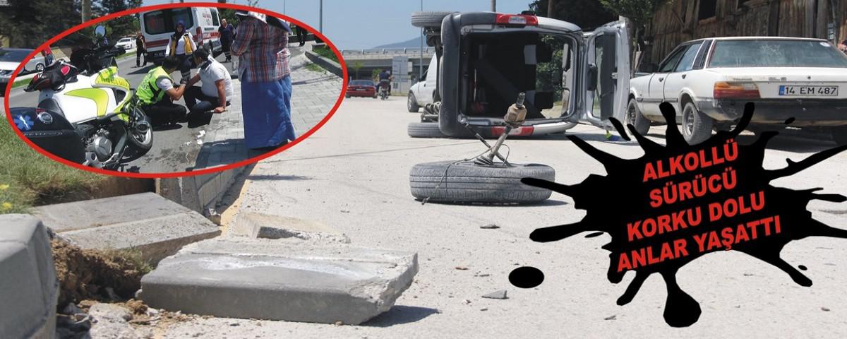 Edinilen bilgiye göre, Bolu’da öğle saatlerinde alkol alan Celal C. isimli sürücü Paşaköy Mahallesi’den D-100 Karayolu istikametine seyir halindeyken otomobilinin kontrolünü kaybederek refüje çarptı. Refüjde bulunan taşların üzerine çıktıktan sonra lastiği fırlayan araç yan yatarak durabildi.