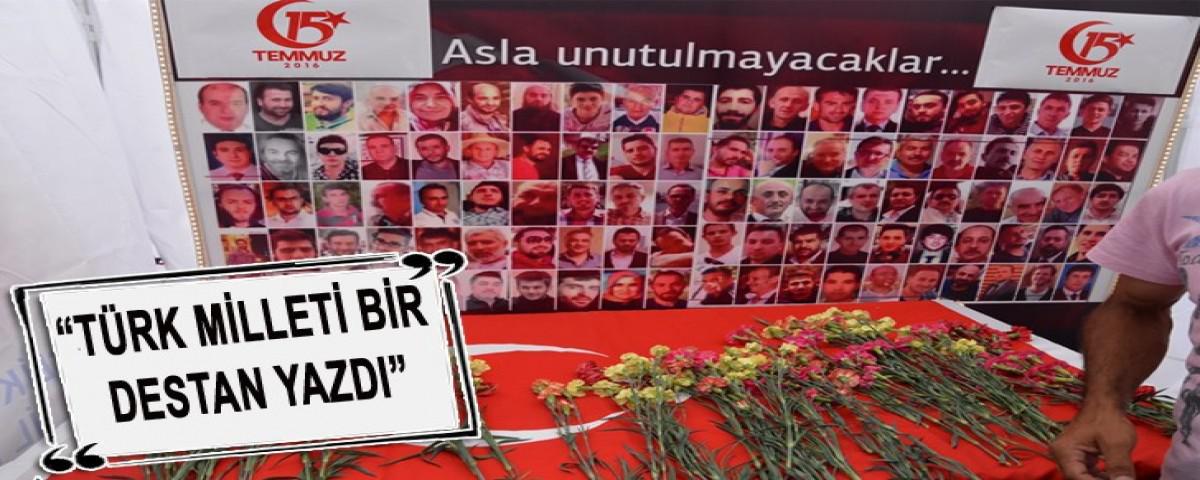 Serginin gezilmesinin ardından açıklamalarda bulunan Vali Baruş, “Bundan bir yıl önce FETÖ ihanet çetesinin kulu, kölesi olmuş kendisini ona adamış hainler tarafından şanlı ordumuzun askerlerinin kıyafetleri içerisine bürünerek vahşice, ahlaksızca ve arsızca bir darbe girişiminde bulunulmuştur. Türk Milleti bu darbe girişimine karşı kahramanlığıyla bir destan yazdı. Bu destanı oluşturan sayfaları hep beraber fotoğraflanmış haliyle şu anda gördük. Bu fotoğraflardan milletimizin demokrasi ve milli irade uğrunda ne kadar büyük bir mücadeleden başarıyla çıktığını görüyoruz ve gençlerimizin, yaşlılarımızın, kadınlarımızın, çocuklarımızın ellerinde bayrak, sadece vatan millet diyerek başka hiçbir şeyi düşünmeden meydanlara akışını, o meydanlarda tankların önüne, silahların önüne, helikopterlerin önüne, uçakların önüne nasıl korkusuzca atıldığını müşahede ettik. Ben tekrar bütün şehitlerimize Cenab-ı Haktan rahmet diliyorum, Gazilerimizi de şükranla anıyorum ve tüm Bolu halkını geçen sene 15 Temmuz’da verilen bu demokrasi mücadelesinin ne anlama geldiğini iyice idrak etmek için bu sergiyi gezmeye davet ediyorum” ifadelerine yer verdi. Daha sonra Bolu Gençlik Hizmetleri ve Spor İl Müdürlüğü tarafından oluşturulan 15 Temmuz Şehitleri’nin fotoğraflarının sergilendiği çadırı ziyaret eden Vali Baruş ve beraberindekiler karanfil bırakarak dua ettiler.