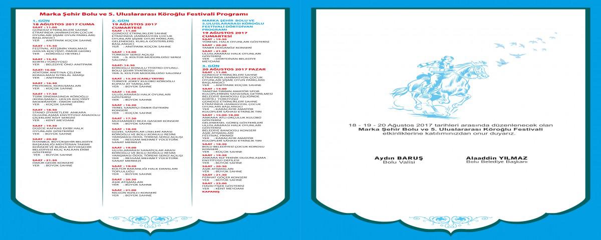 Ünlü sanatçılar Ferhat Göçer ve Ömür Gedik festivalde sahne alarak, en sevilen şarkılarını Bolulular için seslendirecek. Ayrıca Türk sinemasının önemli isimlerinden Hülya Koçyiğit'te sanatseverler ile "Türk sinemasında Köroğlu" konulu söyleşi bir araya gelecek. İşte Marka Şehir Bolu ve 5. Uluslararası Köroğlu Festivali'nin programı şu şekilde: