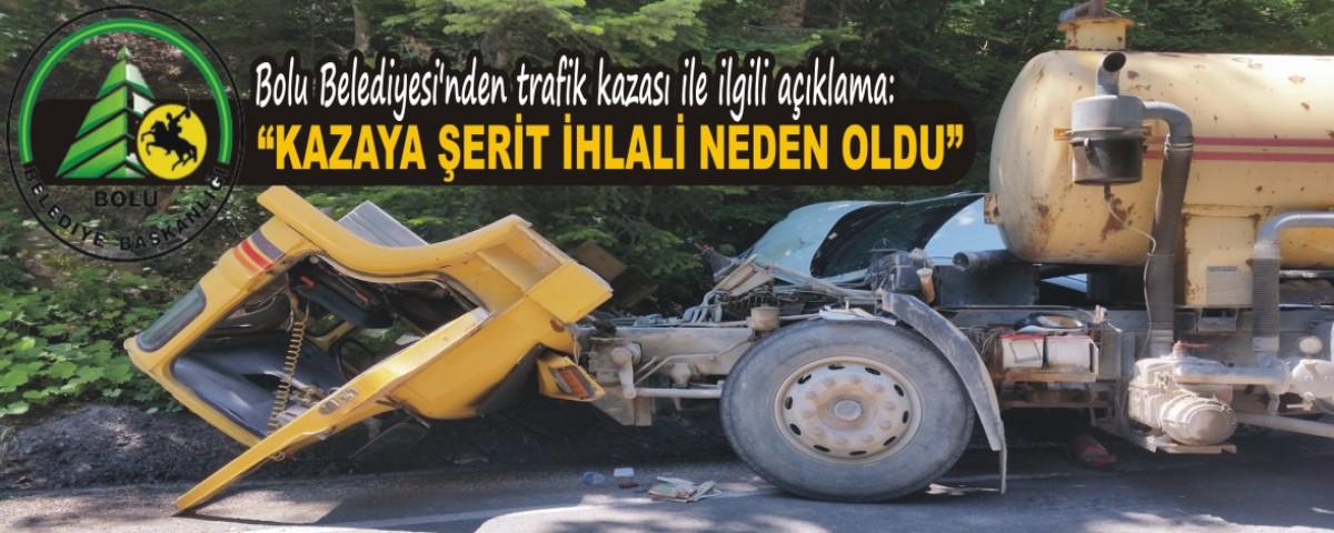 Bolu Belediyesi’nden kaza ile ilgili yapılan açıklama şöyle: “Bolu istikameti, Seben–Kıbrısçık yolu üzerinde, 8 Ağustos Salı günü meydana gelen üzücü kazada Bolu Belediyesi Çevre Koruma Müdürlüğü’ne ait 14 AN 825 plakalı vidanjör, görev dönüşünde, virajda şerit ihlali yapan 34 TK 6595 plakalı araç ile karşı karşıya gelmiştir. Vidanjör sürücüsü, çok daha elim sonuçlar doğurabilecek bir çarpışmayı önleyebilmek amacıyla ani fren yapmış, bu nedenle de aracının kupa kilitleri kopmuştur. Sürücünün aracın kontrolünü kaybetmesi üzerine vidanjör, karşı yönden gelen 14 BL 775 plakalı araçla çarpışmıştır. Üzücü olayda can kaybının olmaması tek tesellimizdir. Kazada yaralanan araç sürücülerine geçmiş olsun dileklerimizi iletiyoruz. Kazaya neden olan 34 TK 6595 plakalı araç şoförünün yakalanması için Emniyet ekiplerinin aramaları devam etmektedir. Bu olay vesilesiyle tüm sürücülerden ve vatandaşlarımızdan, trafik kurallarına dikkatli bir şekilde uymalarını rica ediyoruz.”