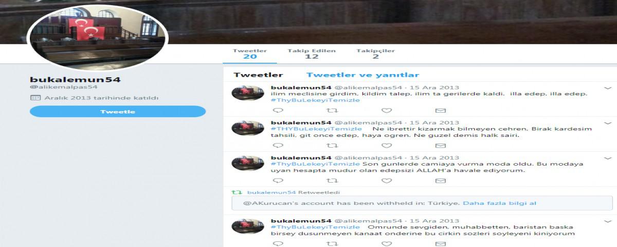 *Dosya içersinde yer alan sosyal medyada @alikemalpas54 kullanıcı ismi ile yer alan twitter hesabı size mi aittir? Bu hesaptan 15 Aralık 2003 tarihli yapılan paylaşımda ‘#ThyBulekyiTemizle ömründe sevginden, muhabbetten, barıştan başka bir şey düşünmeyen kanat önderine bu çirkin sözleri söyleyeni kınıyorum” paylaşımını siz mi yaptınız?’