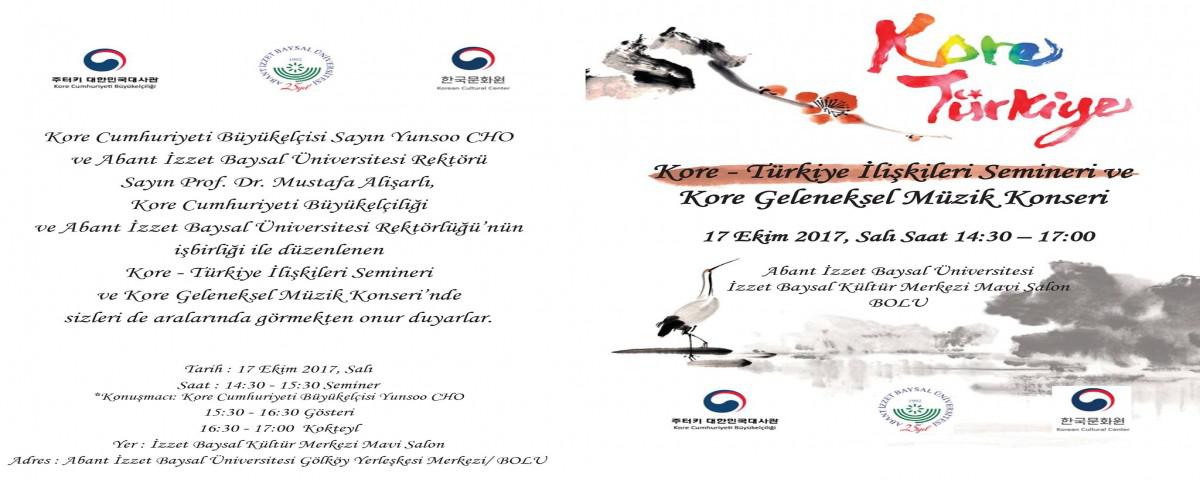 Kore Cumhuriyeti Büyükelçiliği ve Abant İzzet Baysal Üniversitesi Rektörlüğü işbirliği ile üniversite Gölköy Yerleşkesi’nde düzenlenecek Kore – Türkiye İlişkileri Semineri ve Kore Geleneksel Müzik Konseri’na Kore Cumhuriyeti Büyükelçisi Yunsoo Cho da katılacak. 17 Ekim Salı günü yapılacak etkinlik ilk olarak 11.30’da AİBÜ Kültür Merkezi fuaye alanında gerçekleştirilecek “Kore Geleneksel Kıyafet Deneyimi ve Fotoğraf Çekimi” ile başlayacak. Ardından saat 13.00’te Pembe Salonda “Kore’de Eğitim ve Korece Tanıtım” semineri ile devam edecek olan etkinlik saat 14.30’da Mavi Salonda başlayacak olan ve Büyükelçi Cho’nun konuşma yapacağı “Kore-Türkiye İlişkileri” semineri ile devam edecek. Kore Kültür Günü seminerin ardından düzenlenecek Kore Geleneksel Müzik Konseri ve “Ode To My Father” adlı Kore Film Gösterimi ile son bulacak. Abant İzzet Baysal Üniversitesi Rektörlüğü’nden yapılan duyuruda tüm öğrenciler ve Bolu halkı etkinliğe davet edildi.