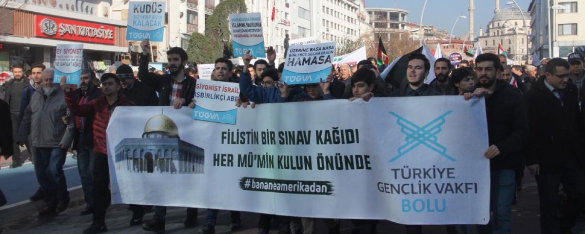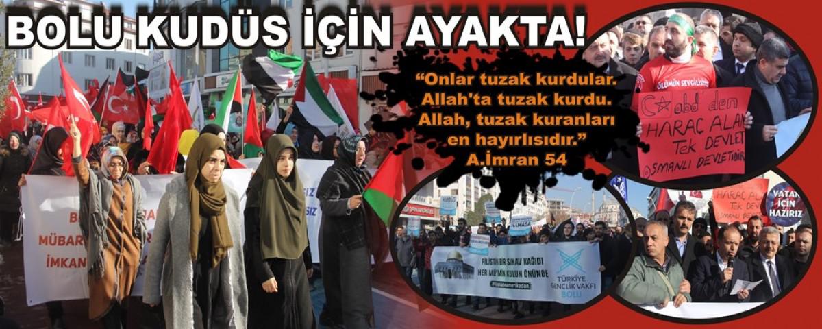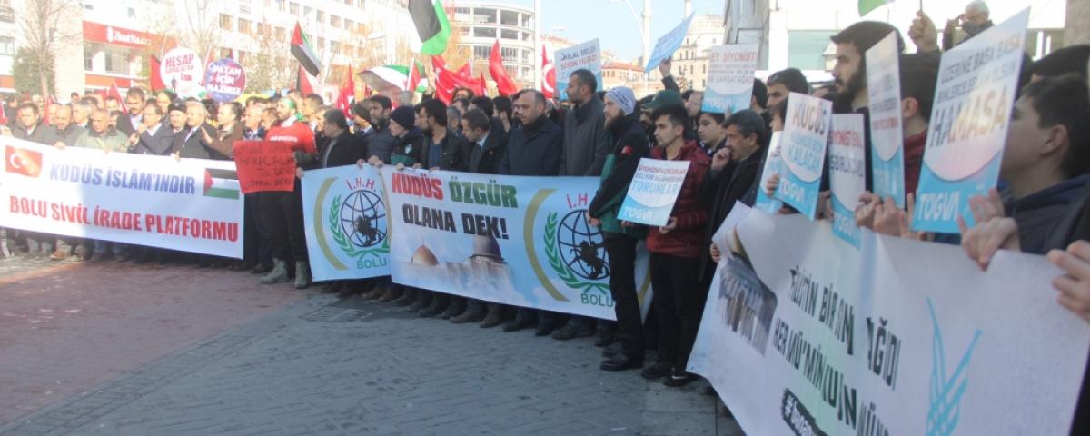 Bolu Sivil İrade Platformu önderliğinde siyasi partiler ve sivil toplum kuruluşları Cuma namazı çıkışında bir araya gelerek ABD Başkanı Trump'ın Kudüs’ü İsrail’in başkenti olarak tanıması kararını protesto etti.