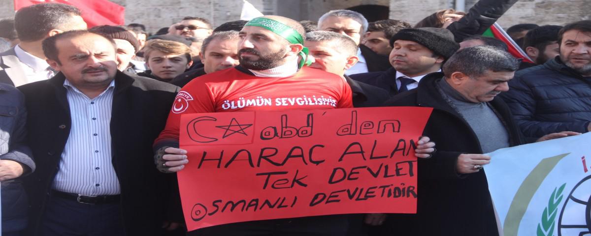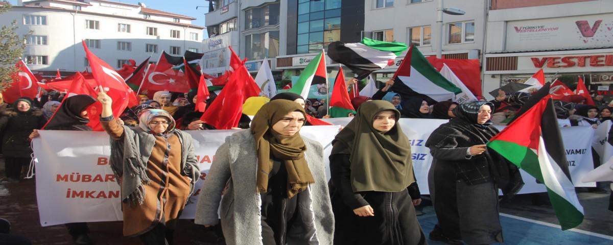 Tabaklar Mahallesi’nde bulunan Kadı Camii önünde Cuma namazı çıkışı bir araya gelen vatandaşlar ABD Başkanı Trump'ın Kudüs’ü İsrail’in başkenti olarak tanıma kararını protesto ederek yürüyüş düzenlendi. Tabaklar Mahallesi’nde bulunan Kadı Camii önünde toplanan yaklaşık 500 kişi adına