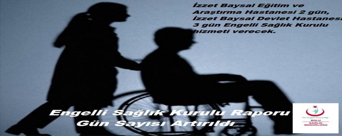 İlimizde Engelli Sağlık Kurulu Raporu vermeye yetkili hastanelerimizden İzzet Baysal Devlet Hastanesi engelli raporu için başvuranlara yönelik 2 gün kurul toplanarak hizmet veriyordu. Şimdi gün sayısı artırılarak 2 günden 3 güne çıkarıldı. İzzet Baysal Devlet Hastanesi Salı, Perşembe ve Cuma günleri Engelli Sağlık Kurul hizmeti verecek.