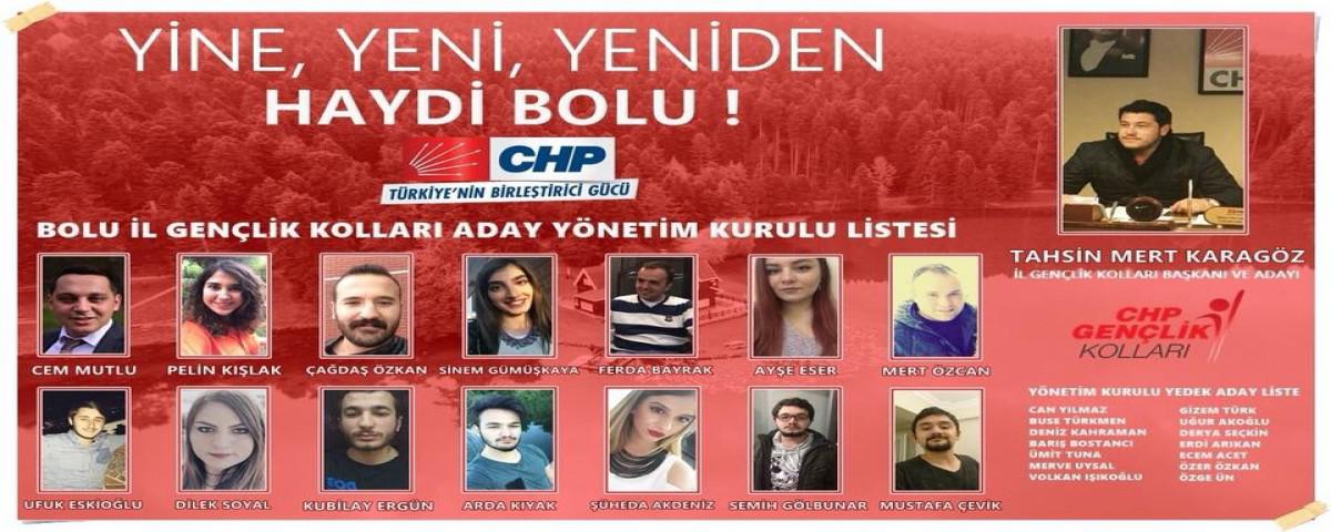CHP Gençlik Kolları seçimleri cumartesi günü gerçekleştirilecek. Göreve yeniden talip olduğunu açıklayan Tahsin Mert Karagöz, Bolu halkını kongreye davet etti. Karagöz yaptığı açıklamada, “Bolu’da yine, yeni, yeniden sloganı ile ayrıştıran değil birleştiren olmak için yönetim kurulum ile bu yola baş koyduk. Rengimiz kırmızı 06.01.2018 Bu Cumartesi günü Bolu Köroğlu kongre merkezinde saat 11:00’de gerçekleştireceğimiz olağan il gençlik kolları kongremizde hepinizin desteğinize talibiz. Tüm Bolu Halkımız Davetlidir” dedi.