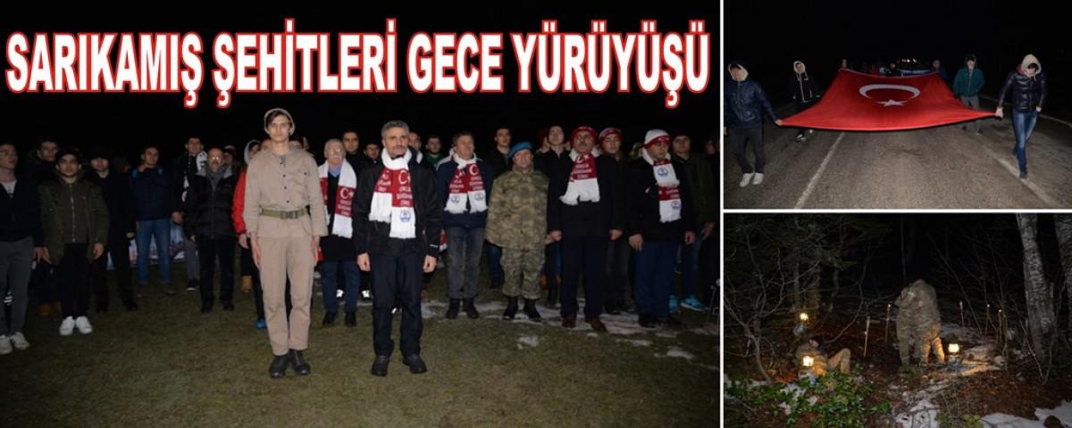“1914 yılını 1915 yılına bağlayan tarihlerde Birinci Dünya Savaşı’nda yurdumuza saldıran Ruslara ve Ermeni çetelerine karşı atalarımız şanlı bir mücadele başlattı” diyen Vali Baruş konuşmasına şu şekilde devam etti; “Allahuekber Dağları’nda Aralık ve Ocak aylarının ne kadar şiddetli bir soğuk getirdiğini Kars’ı, Ardahan’ı bilenler daha iyi anlayacaklardır. Kars’ın, Ardahan’ın kışında havadaki nem donar. Havaya baktığınız zaman, ışığa baktığımız zaman havadaki kristalleri görürsünüz. Hava kristalleşir öyle bir soğuk olur ki ne kadar iyi giyinirseniz giyinin o soğuk 5 dakika sonra hücrelerinize işlemeye başlar. Kanınızın donduğunu hissedersiniz. Yavaş yavaş canınızın çekildiğini hissedersiniz. İşte böyle soğukların olduğu tarihlerde 3’ncü Ordumuz Allahuekber Dağları’na tırmanarak düşmanı Sarıkamış’tan atma mücadelesine girişti. Ama onların üzerinde ne bizim gibi kışlık kıyafetler vardı, ne de kendilerini ısıtabilecek, enerji verebilecek yiyeceklerle yemeklerini donatabiliyorlardı. Her türlü olanaktan yoksunlardı. Kimi askerlerimiz Yemen’den dönmüştü, kimi askerlerimiz güneydoğudan dönmüştü ve üzerlerinde yazlık kıyafetler vardı. Biz burada 15-20 dakika yürüyünce ellerimizin üşüdüğünü hissediyoruz ki şuanda buradaki soğuk Sarıkamış’ın soğuğunun yanında hiç kalır. – 30 derece soğukluğu düşünün ki dağın başındasınız, tipi ve kar yağıyor, siz bir taraftan doğayla, karla mücadele ederken, bir taraftan da kendinizi ısıtmaya çalışıyorsunuz ve sığınabileceğiniz bir yer yok. Ama o askerleri oraya sürükleyen ruh bambaşka bir ruh. İşte bu ruh vatan dendiği zaman bizi göz kırpmaksızın ölüme sürükleyen ruh. Bugün de o ruhun yansımalarını gençlerimizde, askerimizde görüyoruz ve bundan gurur duyuyoruz. Bu ruh bizde olduğu müddetçe bu vatan toprakları üzerinde özgürce ve başımız dik yaşamaya devam edeceğiz. Bu yürüyüşe iştirak eden ve bu ruhu taşıdığını burada ispatlayan bütün gençlerimize çok çok teşekkür ediyorum. Yarın da bu yürüyüşümüz, programımız inşallah daha kalabalık bir kitleyle devam edecek ve atalarımızı rahmetle ve minnetle anacağız. Onların hissettiklerini bir nebze olsun kalbimizde hissetmeye çalışacağız. Sarıkamış’ta ve vatan mücadelesinde ruhunu teslim eden, ebediyete intikal eden bütün şehitlerimizi rahmet ve minnetle tekrar anıyorum. Allah hepsine gani gani rahmet eylesin, mekanları cennet olsun, bizleri de ebedi hayatta onlarla beraber eylesin. Hepinize hayırlı akşamlar diliyorum” Vali Baruş’un konuşmasının ardından Bolu İl Müftülüğü ekibi tarafından Kuran-ı Kerim Tilaveti ve ağıtlar ve türküler söylendi. “Sarıkamış Belgeselleri”nin izlenmesinin ardından Abant İzzet Baysal Üniversitesi Fen edebiyat Fakültesi tarih Bölümü Öğretim Üyesi yardımcı Doç. Dr. Levent Düzcü’nün katılımcılara Sarıkamış harekatı anlatması ile düzenlenen gece etkinliği sona erdi.
