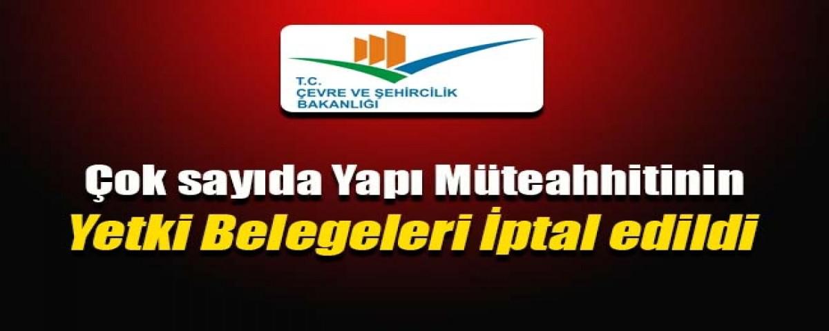 Çevre ve Şehircilik Bakanlığı Mesleki Hizmetler Genel Müdürlüğünden: 3194 sayılı İmar Kanunu’nun ilgili hükümlerine uygun olarak görev ve sorumluluklarını yerine getirmedikleri idarelerince tespit edilen aşağıdaki yapı müteahhitlerinin yetki belge numaraları, aynı Kanunun 42’nci maddesinin dokuzuncu fıkrası doğrultusunda, karşılarında yazılı Bakanlık Makamının Olurları ve sürelerle iptal edilmiştir.