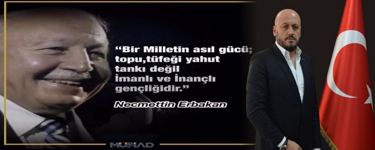 "Milli Görüş kavramı, insanımızın olaylara bakışında ekonomiden, tekniğe, sanattan, kültüre, dış politikadan siyasete milli bir bakış açısıyla yaklaşımını öngören bir kavramdı. Bu kavramı kazandırdı ve ağır sanayi hamlesini başlatan insandı. 1975-1978 yılları arasında Anadolumuzun hemen her tarafında 200 tane ağır sanayi fabrikasının temellerinin atılıp hizmete alınmasının projelerini başlatmıştı. Bunlardan yaklaşık 100'e yakınının temellerini atabilmişti. O zamanlar malum medya ve malum kesimler dalga geçerdi. Erbakan'ın en önemli mirası son 13 yılda bu ülkede özgürlükleri, demokrasiyi genişleten, büyük kalkınma hamlesini başaran, halkına dünya kalitesinde kamu hizmeti veren, refah ve satın alma gücü artışını kazandırmış olan yeni Türkiye mimarlarını talebe olarak yetiştirmesiydi. Rahmetli Erbakan hoca öncülüğünde kurulan MÜSİAD, gün geçtikçe daha çok gelişiyor."