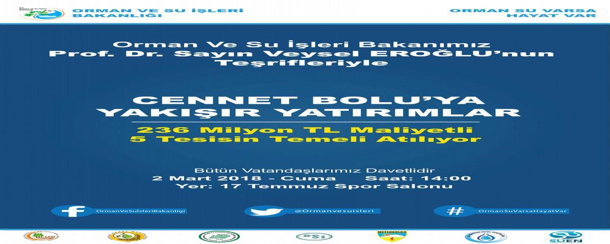 Bakan Prof. Dr. Veysel Eroğlu tarafından temeli atılacak tesislerle 32.800 dekar zirai arazi modern sulama sistemine kavuşacak, 3 milyon 673 bin metreküp su depolanacak. Ormancılık projeleri ile Bolu’da ormanların gençleştirilmesi, bakımı ve iyileştirilmesi sağlanacak. Orman köylüleri desteklenecek. Ayrıca, Yedigöller Milli Parkı’nda yapılacak çevre düzenlemesi çalışmaları ile ziyaretçi sayısının ve memnuniyetin artırılması hedefleniyor.