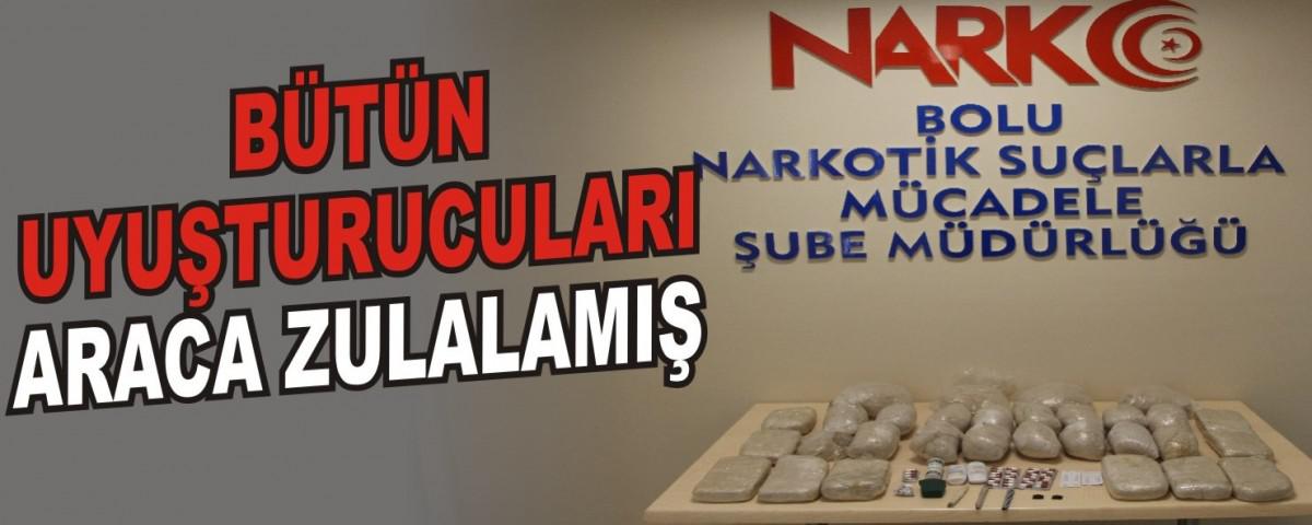 Bolu Narkotik Suçlarla Mücadele Şube Müdürlüğü görevlilerince Bolu genelinde uyuşturucu ve uyarıcı madde ticareti, kullanımı ve aracılığının engellenmesine yönelik olarak yapılan çalışmalarda, 34 Plakalı kırmızı renkli araç şüpheli görülerek durduruldu. Aracın sürücülüğünü yapan M.Ç (34) isimli şahıs üzerinde ve araçta yapılan aramalar sonucu; net ağırlığı 16 kilo 727,74 gram gelen renk, koku ve görünüm itibariyle uyuşturucu maddelerden eroin maddesi olduğu değerlendirilen uyuşturucu madde, 48 adet Sentetik Ecza, 2.16 gram gelen kokain maddesi ve 26.88 gram gelen metamfetamin maddesi ele geçirildi.