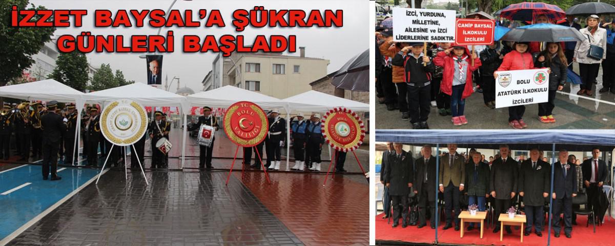 Bolu İl Kültür Müdürlüğünde devam eden tören saygı duruşu ve İstiklal Marşı okunmasıyla başladı. İlk olarak Bolu Halkı adına eski Belediye Başkanı Necdet Gören konuşma yaptı. Gören; “İzzet Baysal şükran günlerini Boluluların bu istemi üzerine başlattık ve 29 yıldır bu olay bu güne kadar devam edip geldi. Kendi sağlığında kendisi ilgi odağıydı. Bütün Bolu halkı kendisine ilgi gösteriyordu ve kendisi de son derece mutlu oluyordu. Bizde Bolulular olarak bununla mutluluk duyuyorduk. Ölümünden sonra benden sonraki Belediye Başkanı arkadaşlarım, valilerim bu olaya özen gösterdiler bundan mütevelli kendilerine teşekkür ediyorum” dedi.