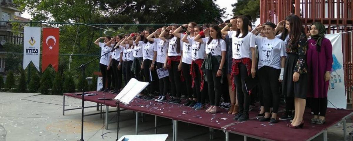 Saygı duruşu, İstiklal Marşı ile başlayan tören Biyoloji Öğretmeni Nesli Güleken Avcı’ nın günün anlam ve önemini belirten konuşmasıyla devam etti. İmza okulları bünyesinde düzenlenen lise sınıflar arası Bahar Basketbol Turnuvası”, “ Atatürk’e Mektup” adlı kompozisyon ve “Hayalimdeki Dünya “ adlı resim yarışmalarının birincilerine ödülleri kurucu Eşref Tarsuslu tarafından verildi. Eşref Tarsuslu konuşmasında “ Ulu Önderimiz Mustafa Kemal Atatürk tarafından armağan edilen bu bayram. Türk milletinin azim ve gayretinin bir eseridir. Bizler bu bilinçle yetişen vatan evlatları olarak aynı bilincimizi ve sevgimizi yeni nesillere aktarmaya devam ediyoruz. Sevgili gençler, genç fikirli demek; doğruyu gören ve anlayan gerçek fikirli demektir. Dileğim, Atamızın biz öğretmenlerden isteği gibi fikri hür, vicdanı hür, irfanı hür nesiller olarak yetişmeniz. Unutmayalım ki birinci görevimiz Türk bağımsızlığını ve cumhuriyetini sonsuza kadar korumak ve yaşatmaktır. Bu görev için muhtaç olduğumuz kudret damarlarımızdaki asil kanda mevcuttur. Bayramınız, bayramımız kutlu olsun” diyerek öğrencilere seslendi.