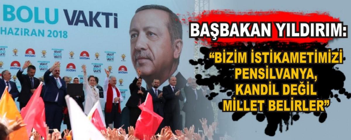 "Bizim istikametimizi Pensilvanya, Kandil değil millet belirler" diyen Başbakan Yıldırım, "Biz siyaseti sadece millet ile beraber yaparız. Milletin hislerine yabancı olanlar AK Parti'yi anlayamaz. Şimdi ne diyorlar, 'Kazanırsak eski düzene geri döneceğiz.' Eski düzende darbe var, sefalet var, yoksulluk var. Dillerinde yapmak kelimesi yok, sürekli yıkacağız, kapatacağız. 'Yerli otomobili yapmayacağız. Hızlı tren göçü arttırıyor diyorlar, yol, köprü yapmak marifet mi diyorlar' Bu ülkeye çaktığınız çivi mi var? Şimdi çıkmış Muharrem İnce, 'FETÖ'yü doğru dürüst istemediniz' diyor. Bu hükümetin kurumlarına güvenmiyorsun, ne olduğu belli olmayan bir adamın telefonuna göre iş yapıyorsun. Adalet Bakanlığı davet etti. Gel bak. 85 klasörlük dosya gönderildi. İncele öyle konuş. Ülkesinin kurumlarına güvenmeyen bu insanlara bu millet emaneti teslim eder mi.? Bunlara bir ders daha verelim mi? 13. derslerini de alsınlar mı?" şeklinde konuştu.