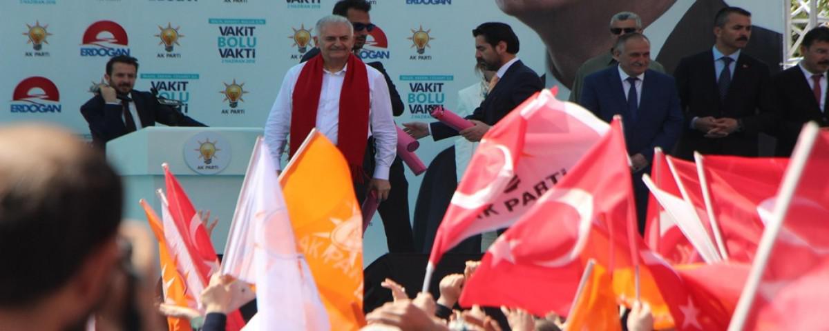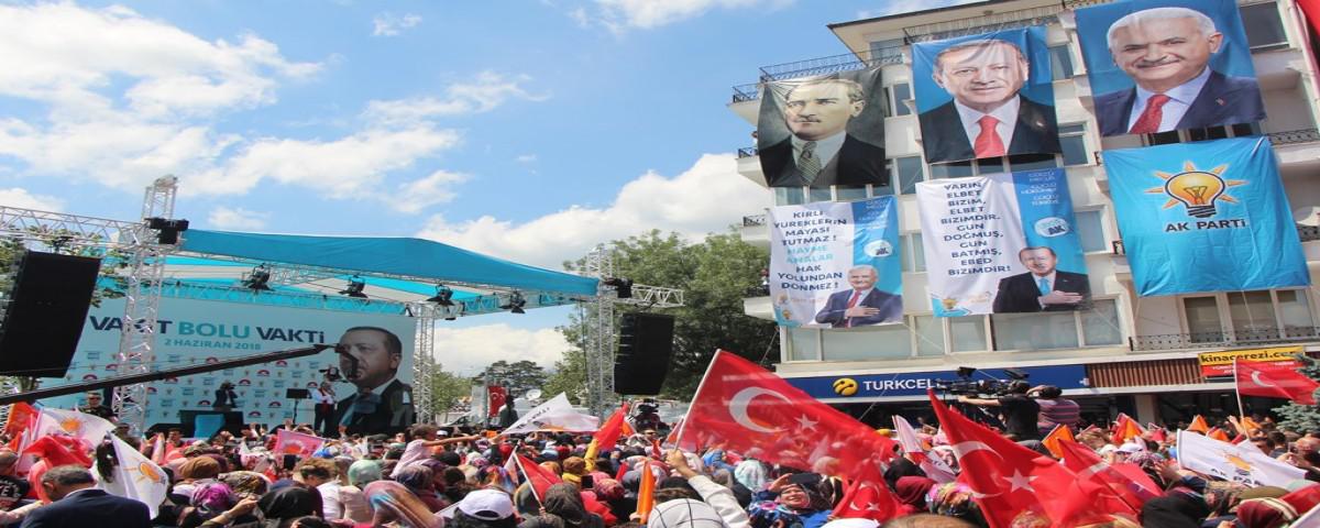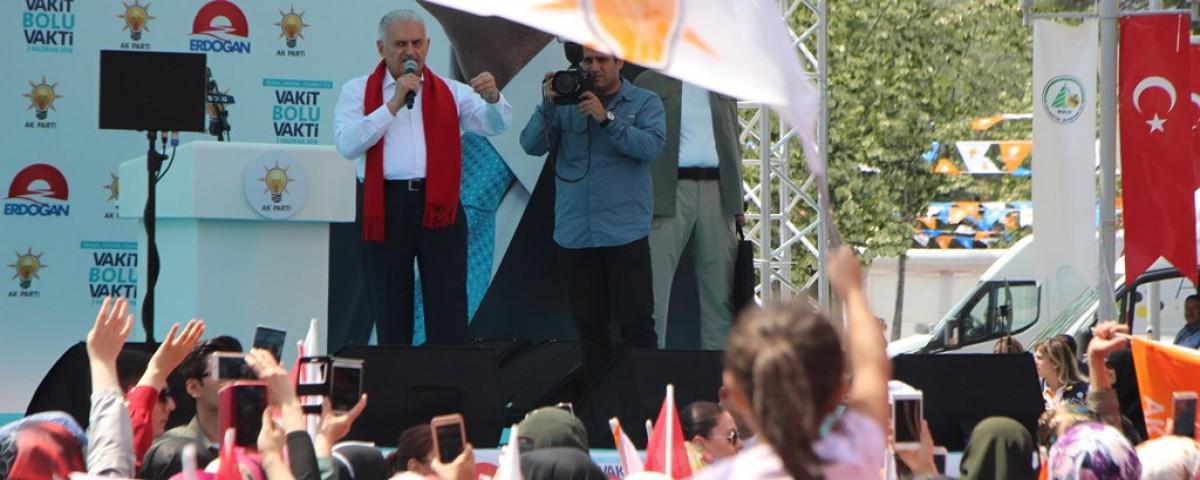 Bolu kent meydanında düzenlenen mitinge vatandaşların yanı sıra Bilim Sanayi ve Teknoloji Bakanı Faruk Özlü de katıldı. Konuşmasına Bolulu vatandaşları selamlayarak başlayan Başbakan Binali Yıldırım, "Bizim Bolu'ya olan muhabbetimiz farklı. Biz ne zaman Bolu'ya gelsek, yiğit Boluluları görüyoruz. Türkiye'nin son yıllardaki yükselişine sizlerle beraber imza attık. 24 Haziran'da yeni bir seçime gidiyoruz. Bu seçim diğerlerinden biraz farklı. İlk defa yeni sistem oylanacak. 94 yıllık demokrasi tarihindeki en büyük değişiklik. Adayları görüyorsunuz. Herkes meydanlarda. Herkes vaat veriyor. Abartılı vaatler veriyorlar. Bütün adayların ortak yanı, 'Recep Tayyip Erdoğan'ı indireceğiz' diyorlar. Bolu milletin adamı Recep Tayyip Erdoğan'a sahip çıkacak mısın? Milletin adamını yeniden Cumhurbaşkanı seçmeye var mısınız? Yeni dönemde Cumhurbaşkanlığı kadar mecliste önemli. Güçlü meclis olursa, güçlü hükümet olur, güçlü Türkiye olur" dedi.
