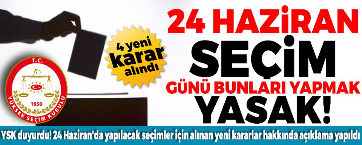 Oy verme günü olan 24 Haziran Pazar günü saat 06.00'dan 24.00'e kadar her ne suretle olursa olsun alkollü içki satılması, içkili yerlerle umumi mahallerde her çeşit alkollü içki satılması ve verilmesi ile içilmesi yasak olacak. Emniyet ve asayişi korumakla görevli olanlardan başka hiç kimse, 5237 sayılı kanunun ilgili maddesi uyarınca köy, kasaba ve şehirlerde silah taşıyamayacak. Oy verme günü oy verme süresince kahvehane, kıraathane ve internet kafeler gibi bütün umumi eğlence yerleri kapalı olacak. Eğlence yeri niteliğini taşıyan lokantalarda yalnızca yemek verilebilecek. Seçim yasaklarına ve yukarıdaki kurallara uyulmak şartıyla oy verme günü saat 18.00'den sonra düğün yapılabilecek. Seçim günü saat 18.00'e kadar radyolar ve her türlü yayın organları tarafından seçimler ve seçim sonuçları ile ilgili haber, tahmin ve yorum yapılamayacak. Radyo ve her türlü yayın organlarında 18.00-21.00 saatlerinde ancak YSK tarafından seçimlerle ilgili olarak verilecek haber ve tebliğler yayımlanabilecek. Bütün yayınlar saat 21.00'den sonra serbest olacak ancak YSK tarafından gerek görülmesi halinde saat 21.00'den önce de yayınların serbest bırakılmasına karar verilebilecek.