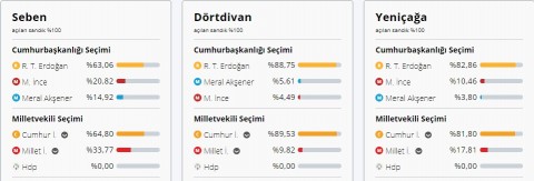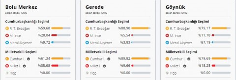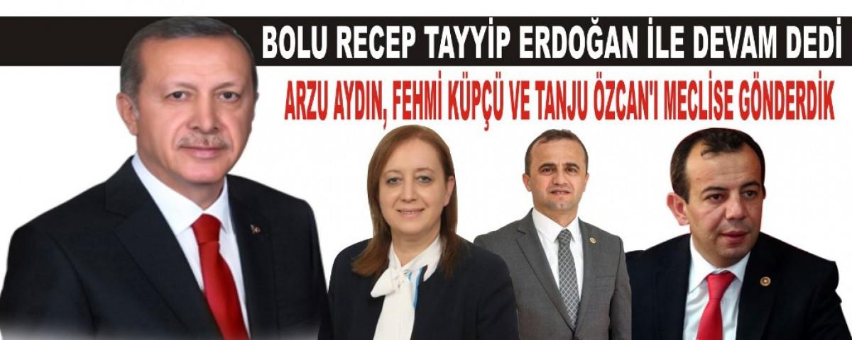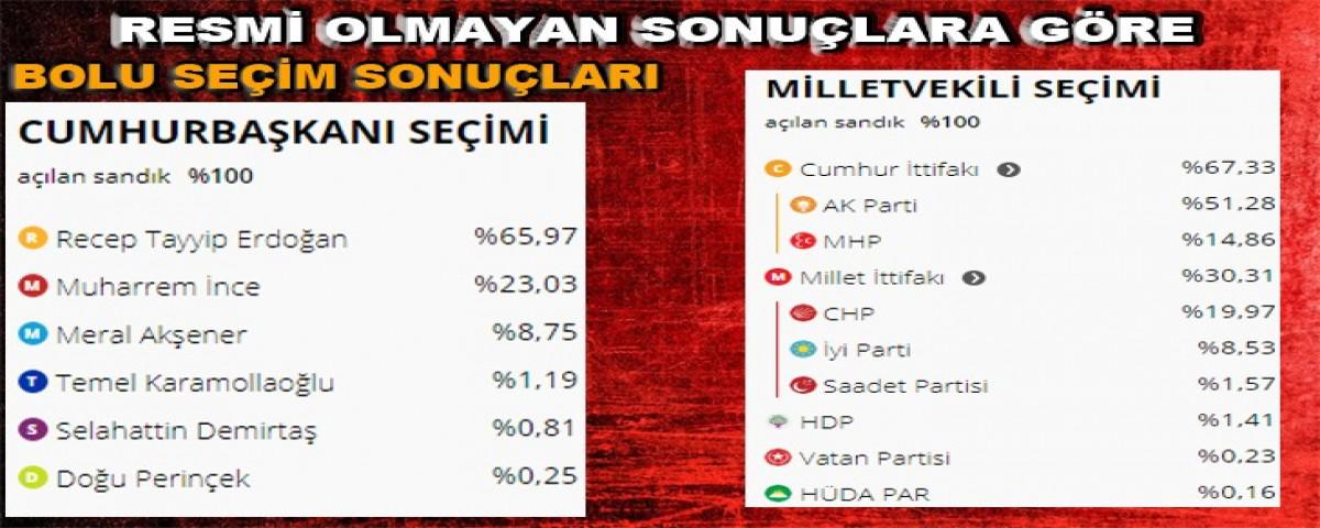 Bolu Cumhurbaşkanı Recep Tayyip Erdoğan ile devam dedi. 222 bin 450 seçmenin 195 bin 900’ü sandık başına giderken, resmi olmayan sonuçlara göre; Cumhurbaşkanlığı seçiminde Recep Tayyip Erdoğan %66 oy aldı. Muharrem İnce %23, Meral Akşener de %8,5’de kaldı.