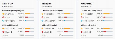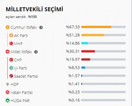 Milletvekilliği seçiminde ise; Cumhur İttifakı %67,3 oy aldı. Bunun %51,3’ü AK Parti, %14,8’ini MHP hanesine yazdı. Millet İttifakı ise Milletvekilliği seçiminde %30,3 oy aldı. Bunun %20’sini CHP, %8,5’ini İYİ Parti, %1,5’ini ise SP aldı.