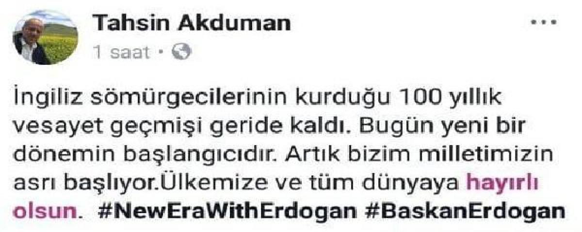 Bolu İl Özel İdaresi eski Genel Sekreteri ve AK Parti Bolu Belediye Meclisi Üyesi Tahsin Akduman, Cumhurbaşkanlığı Hükümet Sistemi ile ilgili sosyal medyadan yaptığı paylaşımda, 'İngiliz sömürgecilerinin kurduğu 100 yıllık vesayet geçmişi geride kaldı. Bugün yeni bir dönemin başlangıcıdır. Artık bizim milletimizin asrı başlıyor. Ülkemize ve tüm dünyaya hayırlı olsun' yazdı. Akduman'ın paylaşımına sosyal medyadaki arkadaşları ve paylaşımını haber yapan birçok yerel gazete tepki gösterdi.