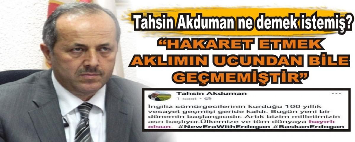 Bolu İl Özel İdaresi eski Genel Sekreteri ve AKP Bolu Belediye Meclisi Üyesi Tahsin Akduman, Cumhurbaşkanlığı Hükümet Sistemi ile ilgili 9 Temmuz tarihinde sosyal medyadan yaptığı paylaşımda, "İngiliz sömürgecilerinin kurduğu 100 yıllık vesayet geçmişi geride kaldı. Bugün yeni bir dönemin başlangıcıdır. Artık bizim milletimizin asrı başlıyor. Ülkemize ve tüm dünyaya hayırlı olsun" yazdı.