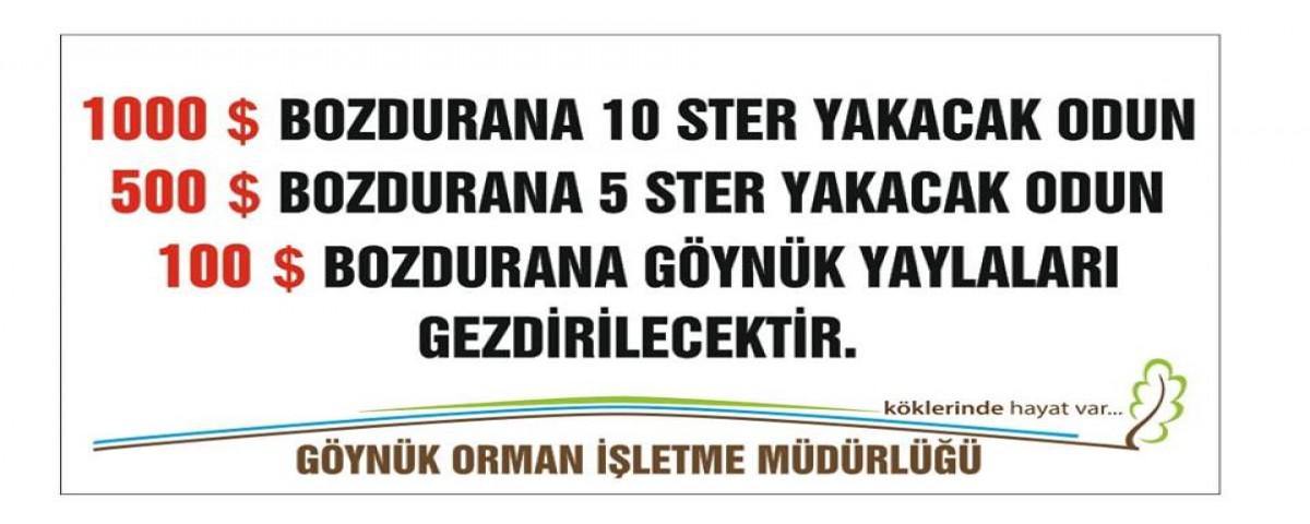 Göynük Orman İşletmesi’nden ilginç kampanya. Ülkemizde doların artmasını protesto etmek için döviz bozdurma çağrılarına kulak verilmesini isteyen Göynük Orman İşletme Müdürlüğü Kurban Bayramına kadar bir kampanya başlattı. Kampanyaya göre bayrama kadar 1000 dolar bozdurana 10 ster yakacak odun, 500 dolar bozdurana 5 ster odun ve 100 dolar bozdurana da Göynük Yaylaları ücretiz gezdirilecek.