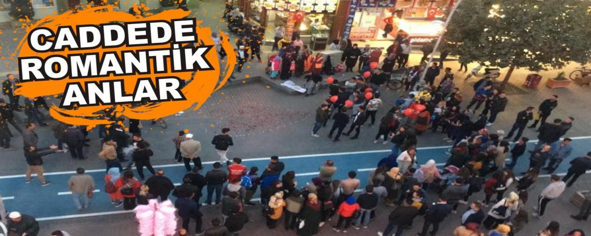 Bolu’nun en işlek yerlerinden biri olan İzzet Baysal Caddesi’nde romantik anlar yaşandı. Akşam saatlerinde cadde üzerinde bir kişi kız arkadaşına sürpriz yaptı. Yere çiçek yaprakları dökerek kız arkadaşına sürpriz hazırlayan vatandaş, onlarca kişinin önünde diz çökerek evlilik teklifi etti. Bu hoş sürprizin ardından kız, kendisine yapılan romantik teklife “Evet” dedi.