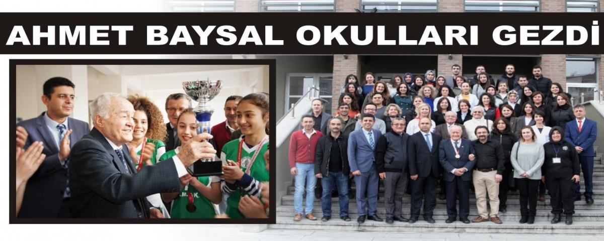 Okul ziyaretlerinde ilk olarak 24 Kasım’da açılışı yapılan İzzet Baysal Ortaokulu’na giden Ahmet Baysal’ı burada Milli Eğitim Müdür Vekili İbrahim Kunuk ve Okul Müdürü Mustafa Çilkara karşıladı. İzzet Baysal Ortaokulu’nu gezen Ahmet Baysal; fen Laboratuvarları, resim ve müzik atölyeleri, Z kütüphane ve zeka oyunları odasına girerek öğretmen ve öğrencilerle tanıştı. Öğrencileri dersliklerinde ziyaret eden Ahmet Baysal öğrencilere derslerinde başarı dileklerinde bulundu. Öğrenciler Ahmet amcalarına yoğun ilgi göstererek yeni okullarına kazandırdıkları ilk kupayı hediye etmek istediler. Öğrencilerin kısa sürede başarılar elde etmesini takdir eden Ahmet Baysal hediyeyi kibarca geri çevirdi. Kupanın okulun ilk kupası olduğunu, okulda kalması gerektiğini söyledi.