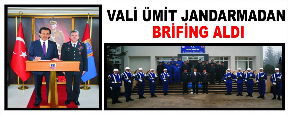 Vali Ahmet Ümit’i İl Jandarma Komutanı Jandarma Albay Nadir Çelik ile İl Jandarma Komutan Yardımcıları, Şube Müdürleri ve Jandarma Personeli karşıladı. Jandarma Şeref Defteri’ni imzalamasının ardından Vali Ümit, İl Jandarma Komutanı J. Albay Nadir Çelik ve Jandarma Başmüfettişi Jandarma Albay Mehmet Salih Taş ile bir süre görüştü. Görüşmenin ardından İl Jandarma Komutanlığı Toplantı Salonu'nda gerçekleştirilen toplantıda, İl Jandarma Komutanı Albay Nadir Çelik tarafından Bolu Valisi Ahmet Ümit’e, Jandarmanın sorumluluk alanında yürütülen faaliyetler, genel güvenlik ve asayiş uygulamaları ile ilgili brifing sunuldu.