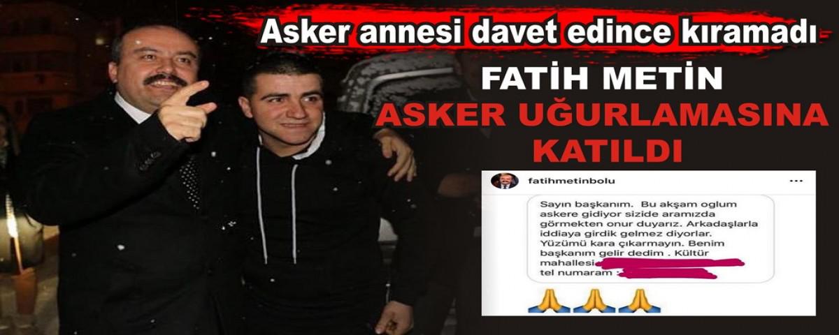 Geçtiğimiz akşam oğlunu askere gönderen bir anne ise arkadaşları ile iddiaya girdiğini söyleyerek Ak Parti Bolu Belediye Başkanı Fatih Metin’i davet etti. Metin’e sosyal medyadan ulaşan anne, “ Sayın başkanım, bu akşam oğlum askere gidiyor sizi de aramızda görmekten onur duyarız. Arkadaşlarla iddiaya girdik, gelmez diyorlar. Yüzümüzü kara çıkarmayın. Benim başkanım gelir dedim” ifadelerini kullanarak sosyal medyadan mesaj attı. Fatih Metin ise annenin bu davetini kıramayarak asker eğlencesine katıldı.
