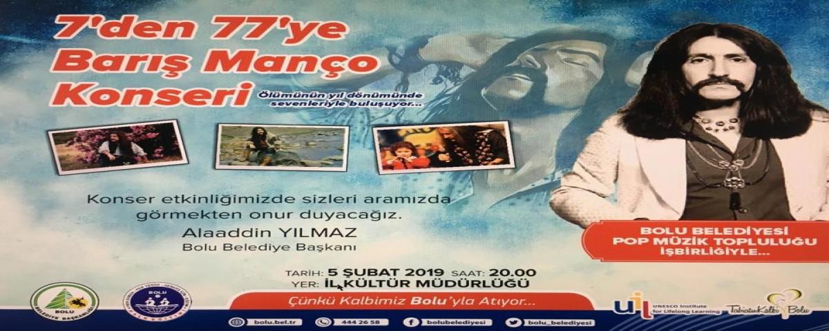 Çalışmalarının Kültür Sosyal İşler Müdürlüğü ve Bolu Belediyesi Pop Müzik Topluluğu tarafından sürdürüldüğü ‘7’den 77’ye Barış Manço Konseri’ usta sanatçının ölüm yıl dönümünde sevenleriyle buluşuyor. İl Kültür ve Turizm Müdürlüğü konser salonunda 5 Şubat 2019 Salı günü saat 20:00’de düzenlenecek. Ücretsiz etkinliğe tüm Bolu halkı davetli... A. Haktan Yamantürk
