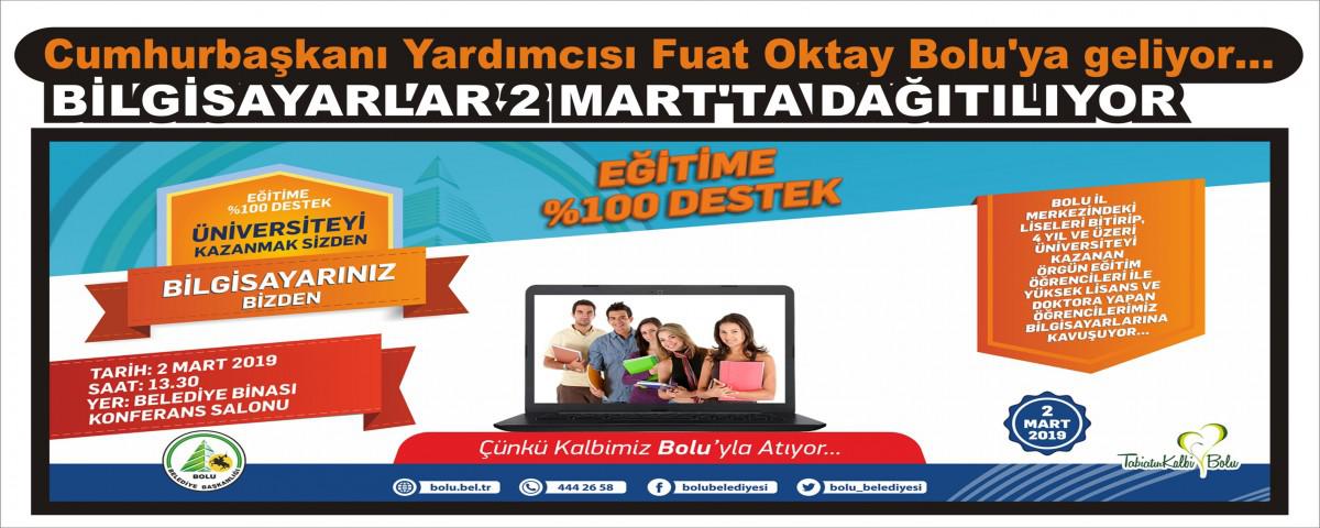Bolu Belediyesi tarafından ‘Eğitime %100 Destek Projesi’ kapsamında, üniversite öğrencilerine verilecek dizüstü bilgisayarların dağıtım töreni Cumhurbaşkanı Yardımcısı Fuat Oktay’ın katılımıyla 2 Mart 2019 Cumartesi günü Yeni Bolu Belediye Binası Konferans salonunda gerçekleştirilecek.