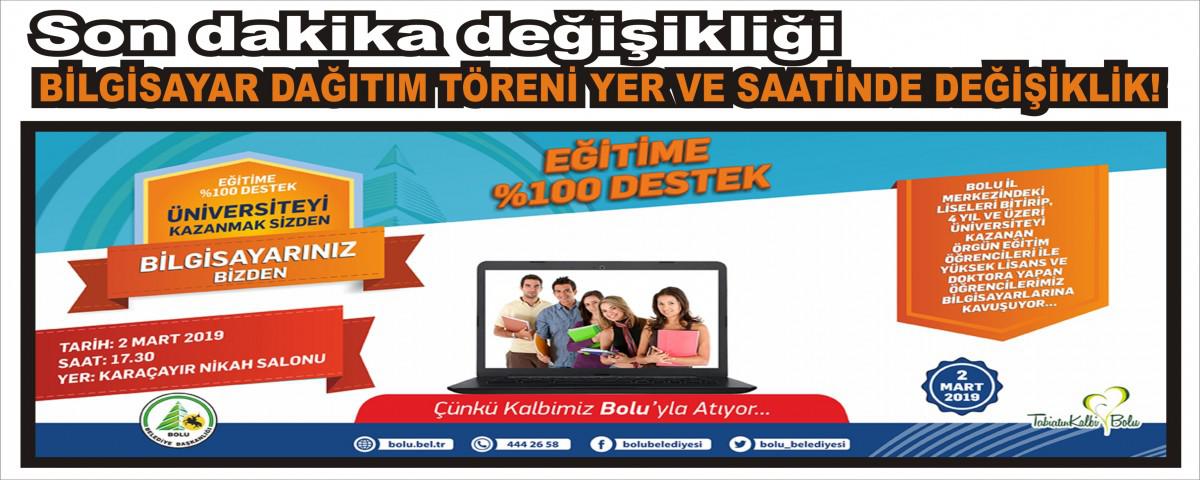 Bolu Belediyesi tarafından ‘Eğitime %100 Destek Projesi’ kapsamında, üniversite öğrencilerine verilecek dizüstü bilgisayarların dağıtım töreni Cumhurbaşkanı Yardımcısı Fuat Oktay’ın katılımıyla 02 Mart 2019 Cumartesi günü Saat: 17.30’da Karaçayır Nikah salonunda gerçekleştirilecek.