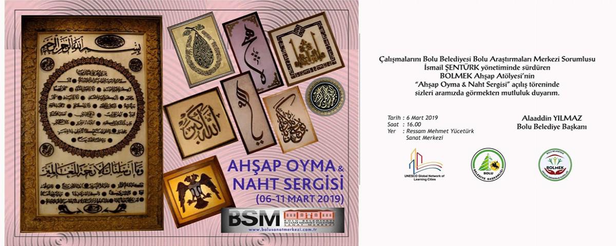 Bolu Belediyesi Meslek Edindirme Kursları’nın kursiyerleri tarafından çalışmalarını Bolu Belediyesi Bolu Araştırmaları Merkezi Sorumlusu İsmail Şentürk yönetiminde sürdüren BOLMEK Ahşap Atölyesi’nin “Ahşap Oyma ve Naht Sergisi” de 6 Mart Çarşamba günü Ressam Mehmet Yücetürk Sanat Merkezi’nde sanatseverler ile buluşuyor. A. Haktan Yamantürk