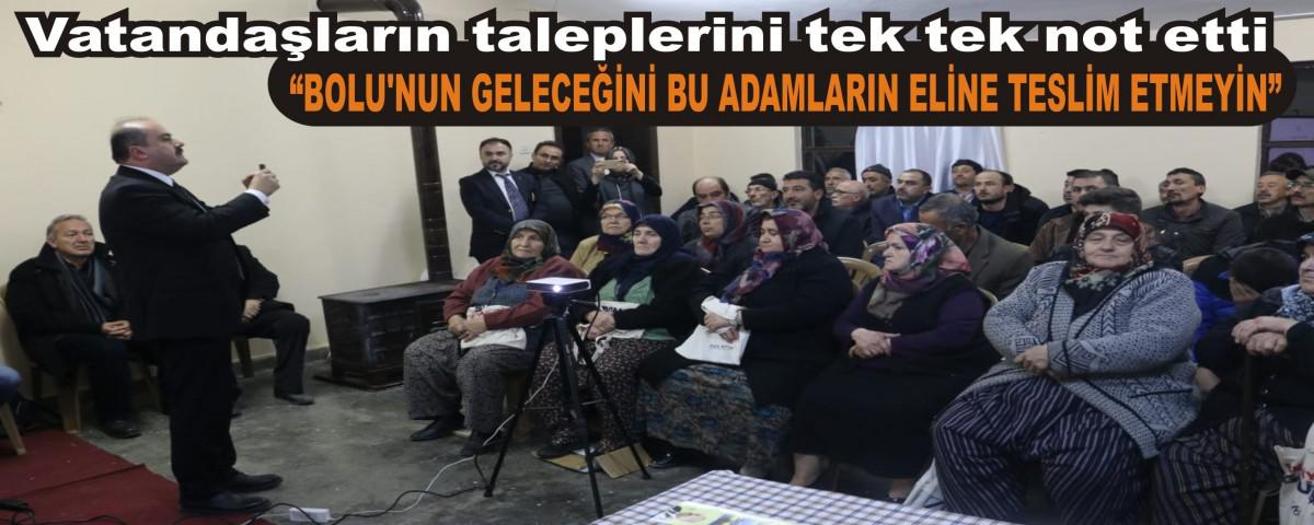 Metin, sözlerinin devamında, Bolu halkına çağrıda bulunarak, “AK Parti’ye kızmış, kırılmış olabilirsiniz ama sizlerden; kırgınlıkla, kızgınlıkla ülkenin ve Bolu’nun geleceğini bu adamların eline teslim etmeyiniz. Bakın bizim tek sloganımız var: Tek millet, tek devlet, tek bayrak, tek vatan. Allah’ın izniyle 31 Martta da bir olalım, iri olalım, diri olalım ve hep beraber Bolu’yu geleceğe taşıyalım” diye konuştu. Metin’in bu sözleri mahalle sakinlerinden büyük alkış aldı. A. Haktan Yamantürk