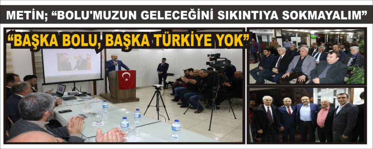 Bolu’nun ve ülkenin geleceğinin maceraya atılmaması gerektiğini söyleyen Metin, Bolu halkına çağrıda bulunarak, “Hep söylüyorum; kırgınlıklar kızgınlıklar olabilir. 17 yıllık iktidarız. Dolayısıyla bu süre içinde her şey dört dörtlük olmayabilir. Yanlışlar, eksiklikler olabilir ama lütfen ülkemizin, Bolu’muzun geleceğini sıkıntıya sokmayalım. Maceraya girmeyelim. Başka Bolu, başka Türkiye yok. Hem hizmet, hem de beka açısından bunun bilincinde olalım. Dünü, bugünü ve yarını düşünmek lazım. Sadece bugünü düşünerek hareket edersek büyük yanlış yaparız. O nedenle bütün vatandaşlarımızdan bu bilinçle hareket etmelerini istiyoruz. Yoksa Allah korusun Bolu’nun 20 yılı boşa gider” diye konuştu.