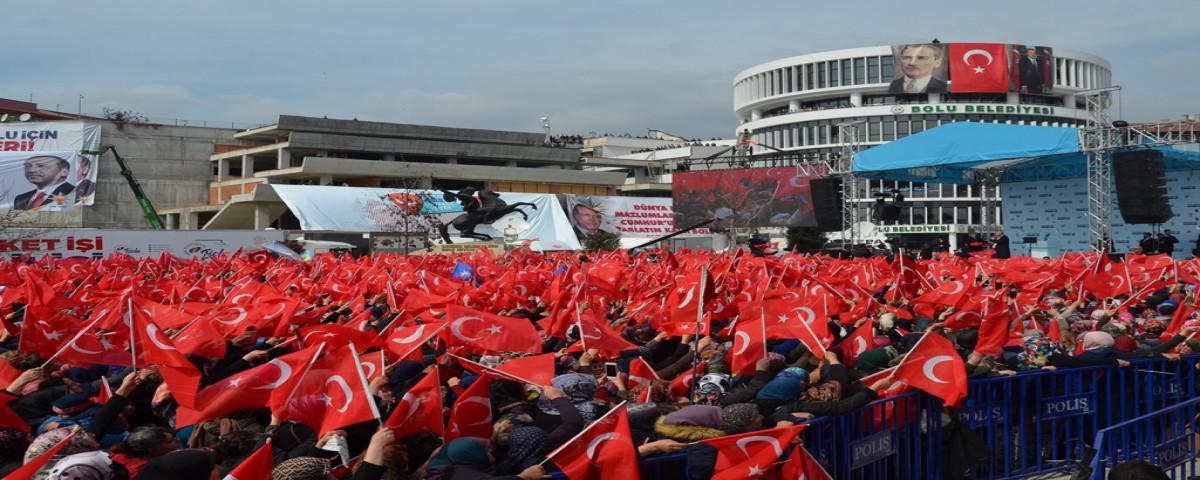31 Mart mahalli ve idari seçimler için Cumhurbaşkanı ve Ak Parti Genel Başkanı Recep Tayyip Erdoğan, Bolu’da dev bir miting düzenledi. Düzce gerçekleştirdiği miting sonrası Bolu’ya helikopter ile gelen Cumhurbaşkanı Erdoğan, Bolu Atatürk Stadyumu’na iniş yaptı. Burada seçim otobüsüne binen Erdoğan, İsmet Paşa Caddesi üzerinde vatandaşlarla buluştu. Kenevirden yapılma bez torbalar içinde vatandaşlara çay dağıtan Cumhurbaşkanı Erdoğan, miting alanına geçti.