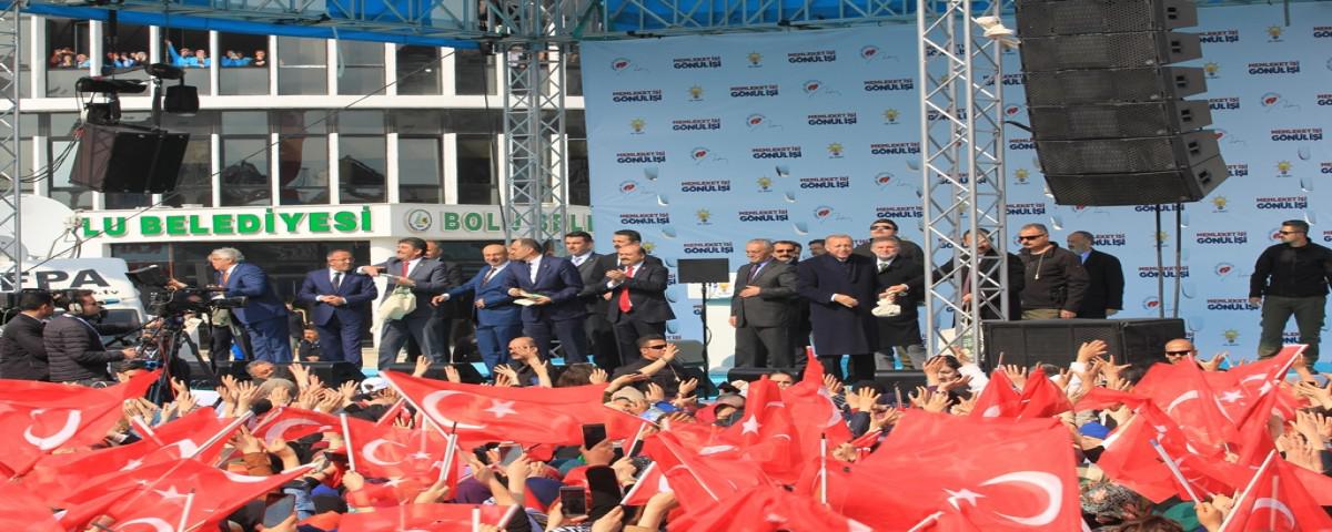 Genel siyasetin ardından yerel seçimler için konuşan Cumhurbaşkanı Erdoğan, 31 Mart’ta Bolulu kardeşlerinin kendilerini yalnız bırakmayacağına inandığını ifade ederek, “Erdoğan yerel yönetim ile hükumet uyumuna dikkat çekerek, "Yerel yönetimde hükumet ile eğer dayanışma olmayan bir yerel yönetim olursa onun da yapacağı pek bir şey olmaz. Biz ne kadar istersek isteyelim o şehrin belediye başkanı istemeyince arzu edilen neticeler gerçekleşmiyor. Türkiye'nin son 17 yılda elde ettiği başarılarda hükumet ve yerel yönetimlerin uyumlu çalışmasının ahenk içerisinde olmasının payı büyük. Bu ahengin bozulmasına müsaade etmemeliyiz. Sizlerden belediye başkanı adayımıza sahip çıkmanızı istiyorum. Bolulu kardeşlerimin bizi yalnız bırakmayacağına inanıyorum" dedi.
