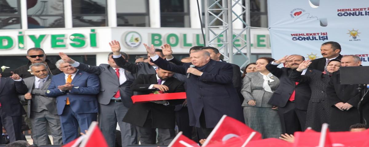 Son olarak Bolu’ya yapılacak olan yatırımlara değinen Cumhurbaşkanı Erdoğan, "Biz Bolu'ya olan sevgimizi kuru sözle değil, eserlerimiz ile de gösterdik. 17 yılda Bolu'ya toplamda 12 katrilyon yatırım yaptık. Birçok yatırımın inşası, plan, projeleri sürüyor. Boluspor birçok başarıya imza atmış, Bolu'nun markası bir takım. İnşallah Boluspor'un stadyum başta olmak üzere ihtiyaçlarının farkındayız. Önümüzdeki dönemde belediyemiz ile işbirliği halinde elimizden gelen desteği göstereceğiz. Bolumuzu çok daha güzel yerlere taşıyacağız. Bolu'nun güzelliğine yeni bir taç daha ekliyoruz. Millet bahçemizin yakında inşasına başlıyoruz. İhsaniye Mahallemizde ki stadyumu millet bahçesine dönüştürüyoruz. Bolu turizmini daha da güçlendireceğiz. Sağlıkta Mudurnu Hastanemizin yapımı, 9 sağlık tesisimizin plan, proje ve ihalesi devam ediyor. Bolu'ya 400 yataklı genel hastane ve 250 yataklı fizik tedavi ve rehabilitasyon hastanesi yapıyoruz. 155 bin dekar araziyi sulayacak barajın inşaatı devam ediyor. Bu yıl içerisinde bu barajı hizmete alıyoruz. Bolu şehir merkezinin içme suyunu ihtiyacını karşılamak için terfi barajı inşa ederek şehrimize memba kalitesinde içme suyu vermeye başladık. Şehrimizin gelecekte ulaşım sorunu yaşamaması için D-100'de battı-çıktılar yapacağız. Bolu Kültür Merkezi'ni inşa edeceğiz" ifadelerini kullandı.
