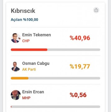 Bolu'nun Kıbrıscık ilçesinde belediye başkanlığını, kesin olmayan sonuçlara göre, CHP'nin adayı Emin Tekemen kazandı. Tekemen yaptığı açıklamada, oy tasnifi sonucunda, Kıbrıscık'ta başkan seçildiğini açıkladı. Kendisinin değil Kıbrıscık'ın kazandığını ifade eden Tekemen, "Gerçekten çok küçük bir ilçeyiz ama Bolu'nun yıldızı olacağız. İlçemizi yaşanabilir bir kent haline getireceğiz. Zorlu bir süreç geçti. 4,5 aydır ayakta, vatandaşla irtibat halindeydik. En sonunda ipi göğüslemeyi de başardık. Hep projelerimizi anlattık ve kazandık." diye konuştu.