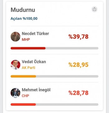 Mudurnu’da ise değişim yaşandı. CHP’de olan belediye başkanlığı 31 Mart seçimleri ile beraber MHP’ye geçti. Mudurnu’nun yeni belediye başkanı Milliyetçi Hareket Partisi’nden Necdet Türker oldu.