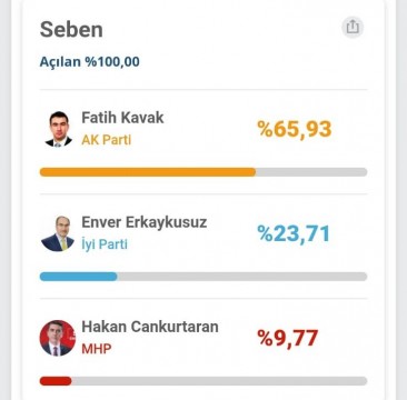 Bolu'nun Seben ilçesinde belediye başkanlığını, kesin olmayan sonuçlara göre, AK Parti'nin Belediye Başkan adayı Fatih Kavak kazandı. Kavak yaptığı açıklamada, oy tasnifi sonucunda, Seben'de başkan seçildiğini açıkladı. Seben için çok güzel olduğunu ifade eden Kavak, "Bu başarı teşkilatımızın desteği ile oldu. Arkadaşlara teşekkür ediyorum. Seben'e hizmet etmek için elimizden gelenin en iyisini yapacağız." diye konuştu.